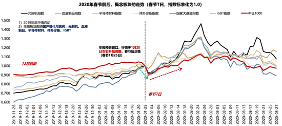 2020年“春季躁动” :上年12月启动、1月20日左右调整、春节后企稳。2020年“春季躁动” :于2019年底启动。主线板块围绕国产替代与医药:光刻机、血液制品、半导体材料、体外诊断、IGBT。期间,1月份的年报预告窗口,市场于1月20日左右开始调整,春节后企稳(春节1月25日)。