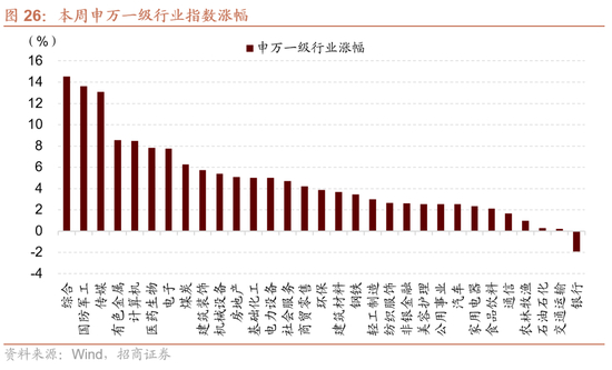 从行业上看,本周申万一级行业涨多跌少,综合(14.55%)、国防军工(13.63%)、传媒(13.10%)等表现较好;银行(-1.90%)、交通运输(0.23%)、石油石化(0.29%)等表现相对较差。从上涨原因看,本周涨幅较大的板块及主要原因:综合(成分股业务多元受益于普涨行情,权重股受服务器、光模块催化)、国防军工(商业航天政策支持明显,星河动力谷神星(遥七)发射预期叠加箭元科技火箭回收基地动工,板块催化密集)、传媒(AI应用全面爆发,豆包接入春晚,智谱华章和MiniMax港股上市点燃国内AI应用情绪);跌幅居前的行业原因,银行(本周市场风险偏好提升,银行作为防御性板块面临资金流出压力)、交通运输(元旦假期后出行需求短期回落,本周资金流出传统行业)、石油石化(国际原油整体下行,委内瑞拉地缘冲突局势缓解)。