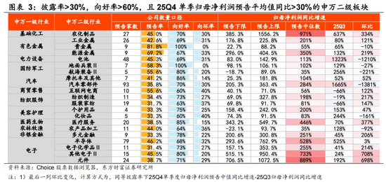 申万一级行业中向好率前三的行业为非银金融、钢铁、有色金属,考虑到披露率较低导致的一级行业数据准确度问题,我们进一步从申万二/三级细分领域出发,当前披露率>30%,向好率>60%,且板块25Q4单季度归母净利润预告平均值同比增速>30%的高景气板块仍是主要集中于【涨价链+科技+高端制造】线索::