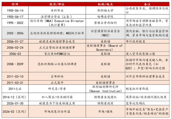 总体来看,沃什的履历可以概括为——其用华尔街的任职资历、与金融市场协同的语言进入白宫,再用白宫的政策协调能力进入美联储。