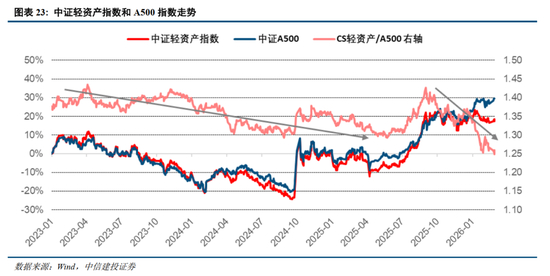 “HALO”交易在A股市场似乎也有迹可循。一方面,今年以来表现最好的前8个行业基本均属于中上游周期制造板块,市场表现大幅领先作为AI行情核心的通信行业;另一方面,对比中证轻资产指数和A500指数,2023年以来轻资产指数出现持续跑输的趋势,2025年三季度出现一定补涨,随后跑输趋势反而变得更加明显。