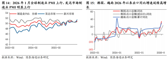 具备全球竞争优势的制造业出海。在通胀整体回落与美联储降息的背景下,全球制造业景气度与投资增速边际改善,除AI投资继续扩张之外,全球基础设备建设与制造业产业转移也在进一步加速。2026年1月,全球制造业PMI加速改善,为2024年6月以来的最高水平,结构上,印度、东盟、美国和日本均呈现强劲增长。对利率环境最敏感的新兴经济体当前国内信贷普遍高速增长,25Q4东南亚、中东欧等国家国内信贷增速继续高位抬升。发达国家方面,美国、欧洲设备投资增速在2025年持续提升。我们认为,在全球央行降息周期与各国国内积极的产业政策推动下,全球制造业的新一轮产业转移与复苏趋势正愈发清晰,典型的外向型经济体如韩国、越南1-2月出口高频数据高位抬升。这意味着中国具备国际竞争优势的产业出海仍然是2026年最具确定性的增长趋势之一。继续推荐机械、电力设备、商用车等。