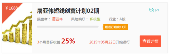 2015年5月4日到5月11日,8个自然日内达成12.33%的高收益,远远高于同期股指的-1.41%,完成屠亚伟短线创富计划01期。