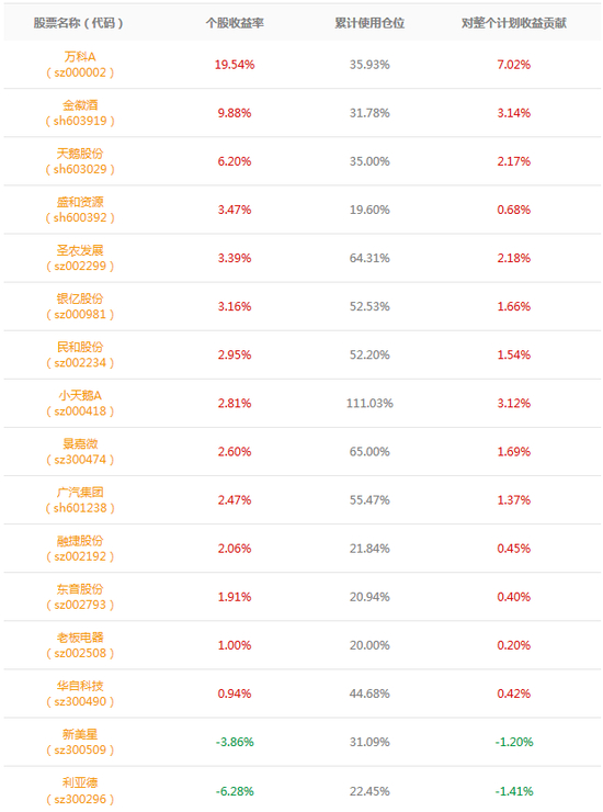 蒋富君老师03期计划共持有16只股票,14只获益,仅2只小幅亏损。其中万科A个股收益高达19.54%,蒋富君对万科A的操作也非常简单,在7月7日建仓一笔,以每股18.80元买入191手,于8月8月平仓一笔,以每股22.51元全部卖出,最终赚得超高收益,为计划的成功做出很大贡献。