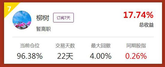 新晋十强柳树,目前排名第七。从开赛到现在,柳树一共操作八笔,以中线战法稳健操盘,截至收盘,总收益已达17.74%。今日柳树卖出持股十余日的科森科技,单笔收益22.73%更是令人惊艳!