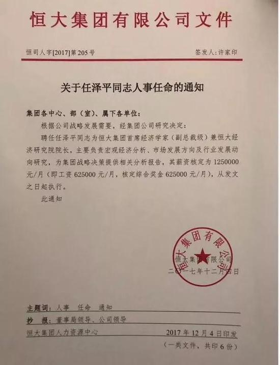 12月4号下午的一封人事任命通知刷爆了朋友圈,恒大集团主席许家印亲自签发,知名经济分析师任泽平月薪125万元入职恒大集团,担任恒大集团首席经济学家(副总裁级)兼恒大经济研究院院长。