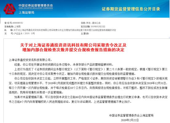 今年2月22日,因其在开展证券投资顾问业务过程中未保存部分产品的营销留痕材料,上海证监局对其采取责令改正及增加内部合规检查次数并提交合规检查报告措施的决定。