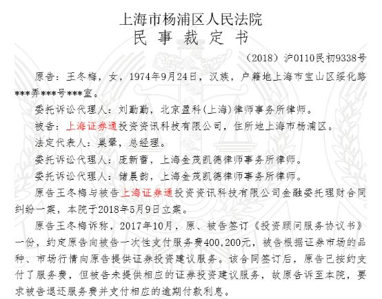 此外,另有数名个人投资者因对“上海证券通”提供的投资建议服务不满而提起诉讼。不过,涉及案件因存在管辖权异议,目前尚未披露后续结果。
