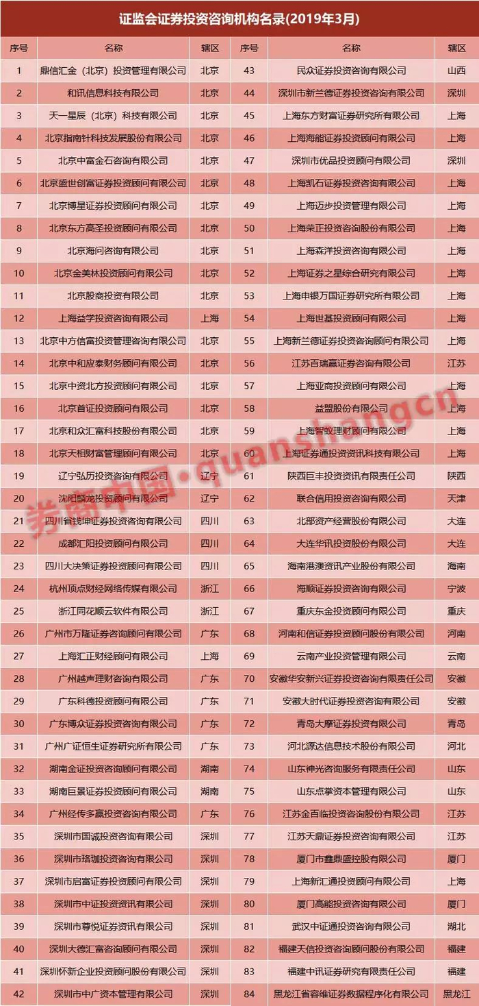 券商中国记者查询证监会网站公布的证券投资咨询机构名录(2019年3月)发现,目前获得牌照的正规证券投资咨询机构共有84家,其中北京和上海辖区有17家,深圳辖区有10家。