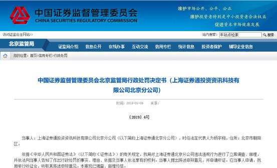 5月9日,北京证监局网站消息显示,对“上海证券通”北京分公司向投资人承诺收益、传播虚假或误导投资者信息的行为,责令改正,并处以30万元罚款;对其毁损有关文件和资料的行为,给予警告,并处以50万元罚款。