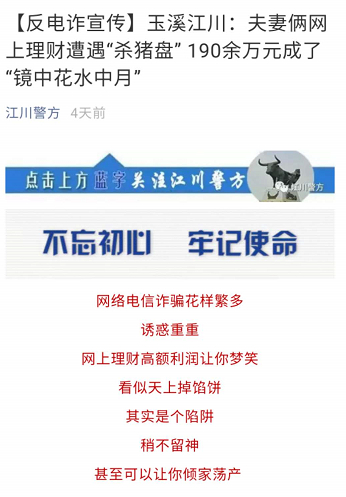 据云南省江川警方,近日,江川区大街街道的陈某和妻子下载了APP上推荐的一个理财平台进行投资,本以为可以大赚一笔,不料深陷“杀猪盘”,自己账户里的资金被“冻结”,190余万元钞票成了“镜中花、水中月”,看得见摸不着,全家心急如焚。”