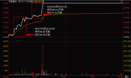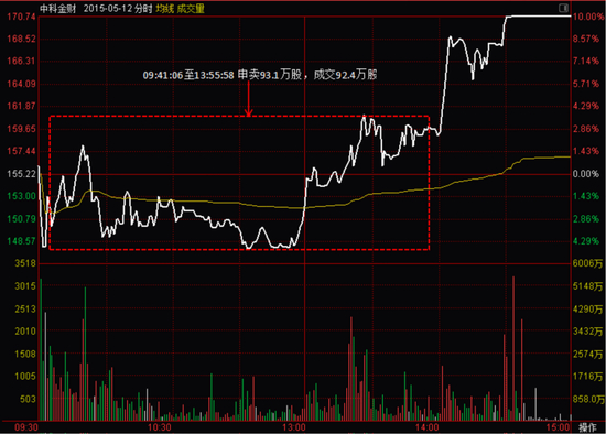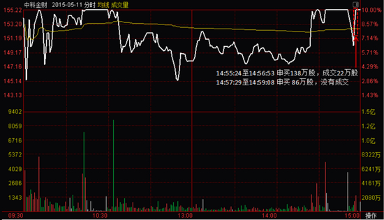 中科金财在2015年5月11日的分时走势一度出现烂板,盘中成交明显放量,但是在临近收盘前,孙国栋连续大笔申买并成交,将股价重新送上涨停位置。