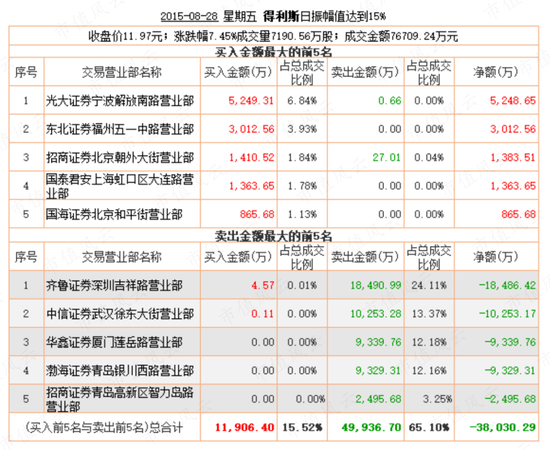 2015年8月28日,得利斯被信托机构强平了,当日龙虎榜数据显示,卖一至卖四全是吴峻乐等人此前操纵特力A的席位,合计被强平卖出5亿元,按当日跌停价9.99元计算,约5000万股。