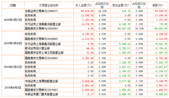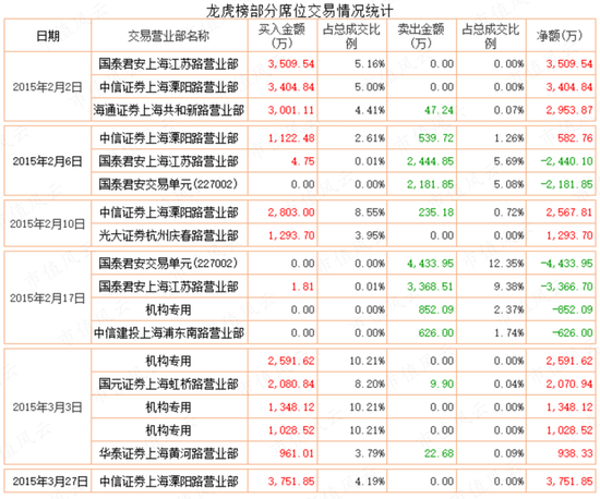 分析全通教育自2015年2月至3月的龙虎榜数据,会经常看到上文提到的几个熟悉席位,比如中信溧阳路、国泰君安上海江苏路、海通上海共和新路、国泰君安227002交易单元、华泰上海黄河路、光大杭州庆春路、中信建投上海浦东南路等。