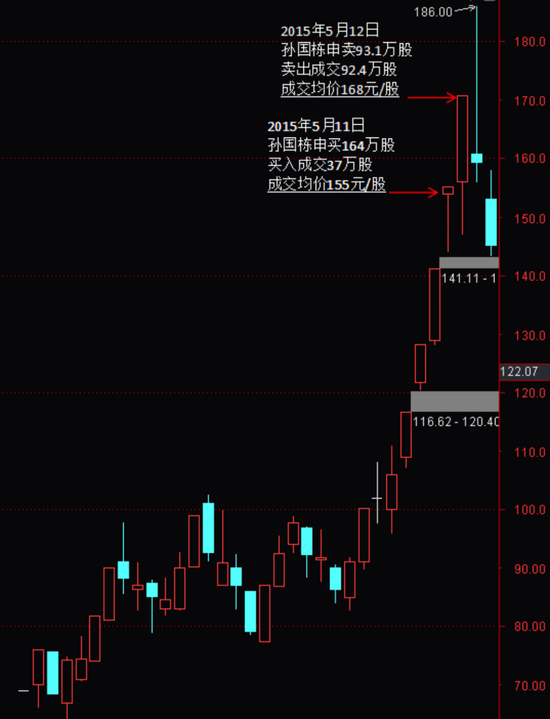 孙国栋的操作完整贯穿中科金财的末期加速上涨阶段,只不过被证监会认定为操纵股价的时间段集中在2015年5月11日、12日两天。