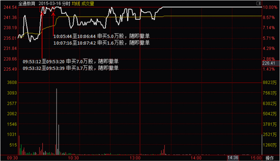 孙在涨停位置的玩法是频繁申卖和撤单。2015年3月16日,全通教育在快速冲击涨停后,其在涨停位置申卖后,又快速撤单。