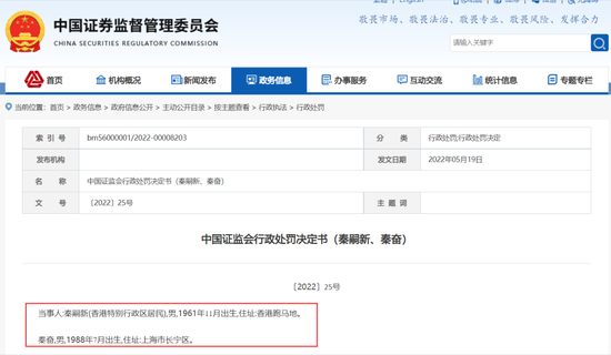这份行政处罚决定书,揭开了有“沪上皇”之称的秦奋与其父秦嗣新共同参与的鑫茂科技相关重组内幕交易案。