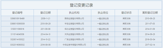 中证协登记信息显示,唐某在2016年8月加入广州证券(现中信证券华南股份有限公司),2017年2月即办理离职登记,执业时间仅有半年,后续未再有证券执业登记信息。