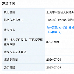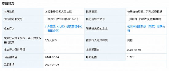 据天眼查APP显示,近日,九州建元(北京)投资管理中心(有限合伙)新增一则股权冻结信息,股权被执行企业为杭州米络星科技(集团)有限公司,股权数额为3万人民币,冻结期限为2023年7月5日至2026年7月4日,上海市奉贤区人民法院为执行法院。案件审理流程显示,冻结关联司法案件为非法吸收公众存款案。