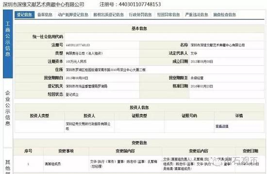 而据深缘文献艺术典藏中心网站显示,该典藏中心成立于2013年8月8日,坐落于深圳证券交易所广场8楼,兼具美术馆和博物馆的双重功能,托管、收藏和展示书画艺术品、古玩艺术品等。