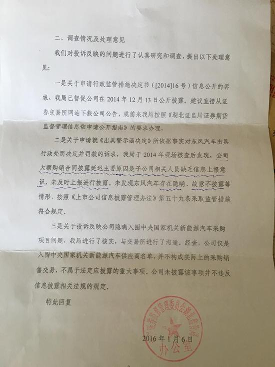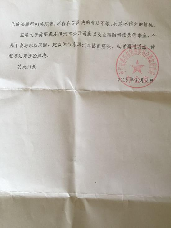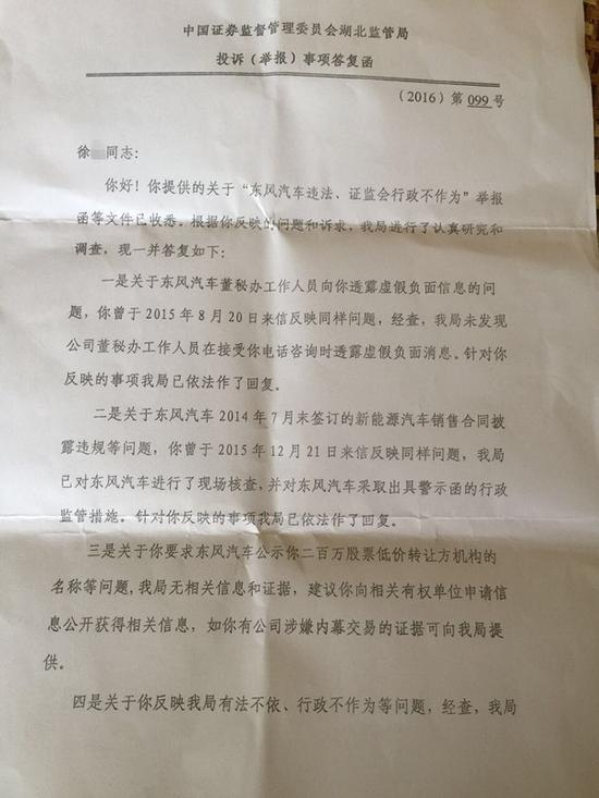 2016年8月9日,湖北证监局回复称,经调查不存在徐女士所说有法不依、行政不为等情况,另外,就徐女士要求的东风汽车公开道歉及全额赔偿事宜,不属证监局权职范围,建议徐女士与东风汽车协商解决,或通过法律途径解决。