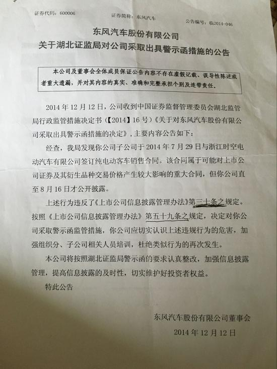2014年12月,中国证监会湖北监管局发布《关于对东风汽车股份有限公司采取出具警示函措施的决定》,称东风汽车信息披露违规,违反了《上市公司信息披露管理办法》第三十条规定,并按照《上市公司信息披露管理办法》第五十九条规定对东风汽车采取警示函监管措施。2014年12月12日,东风汽车发布关于湖北证监局对公司采取出具警示函措施的公告,称会按照湖北证监局警示函的要求认真整改,并表示以后会加强信息披露管理。