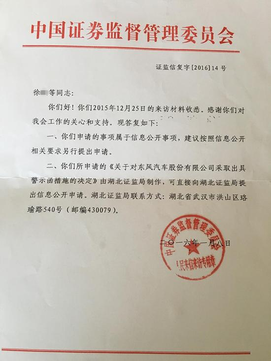 证监会回复称,徐女士申请的《关于东风汽车股份有限公司采取出具警示函措施的决定》由湖北证监局制作,可直接向湖北证监局提出信息公开申请。