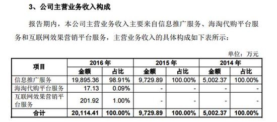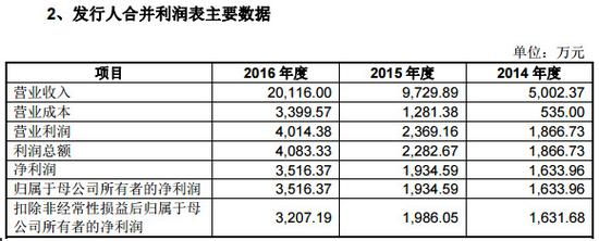 据招股书,报告期内,公司的主营业务收入分别为5002万元、9730万元、2.01亿元,2015 年和 2016 年增长率分别为 94.51%和 106.73%。