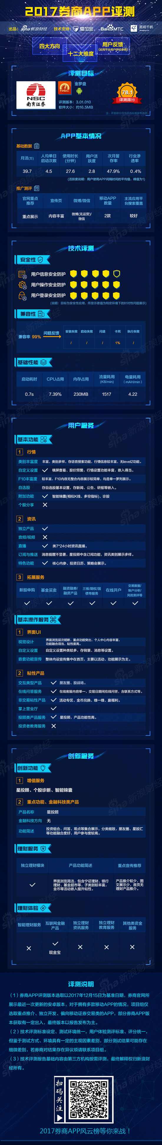 南京证券金罗盘评测得分78.1分,其星投顾功能表现突出;交互型、非交易粘性产品较多;智能产品创新度一般;理财服务功能较好,但产品推介较少。技术评测中,金罗盘安全性、兼容性表现良好。