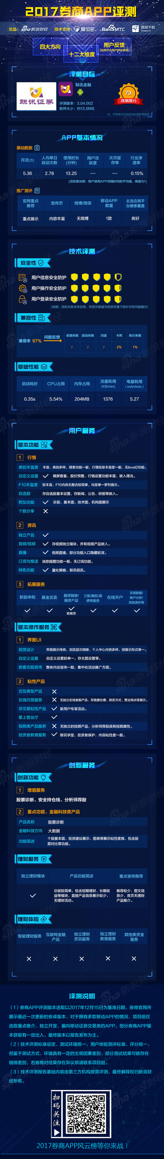 联讯证券联讯金融评测得分73分,其产品功能创新度一般;投资类信息较丰富;粘性产品种类很少;行情、资讯基础服务表现突出。技术评测中,联讯金融兼容性为97%。