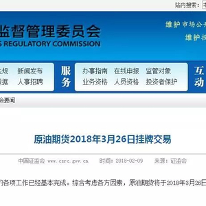 2月9日,中国证监会在例行新闻发布会上宣布,原油期货上市各项工作已经基本完成,确定将于2018年3月26日挂牌交易。
