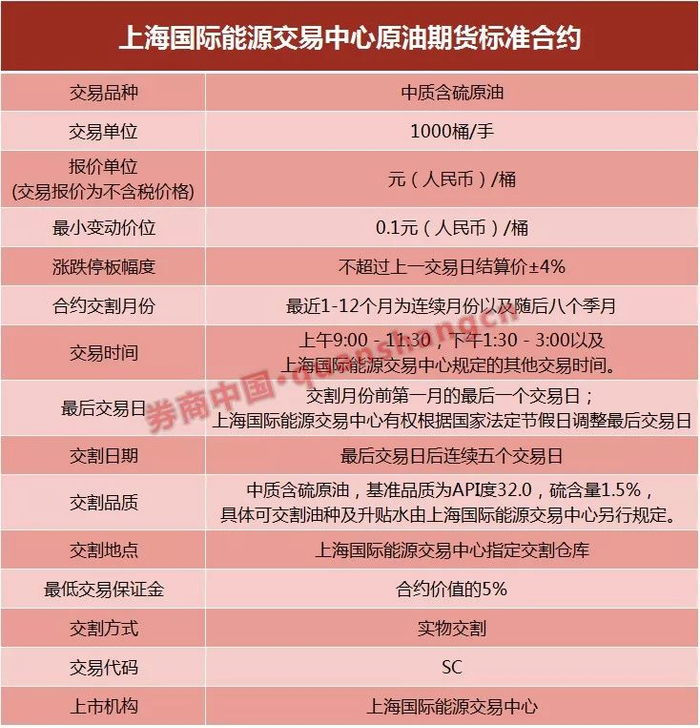 根据已公布的《上海国际能源交易中心原油期货标准合约》,原油期货标准合约交易品种为中质含硫原油,交易代码为SC,涨跌停板不超过上一交易日结算价±4%,交易单位为1000桶/手,合约采取人民币报价。