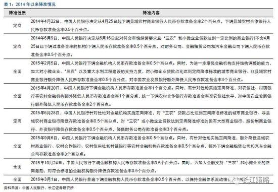 2014年以来,央行共进行了8次降准,其中3次为定向降准(2014年4月,2014年6月和2015年6月),5次为全面降准(2015年2月,2015年4月,2015年9月,2015年10月和2016年3月)。(部分全面降准的同时进行了定向降准,这种情况我们将其归类为全面降准)