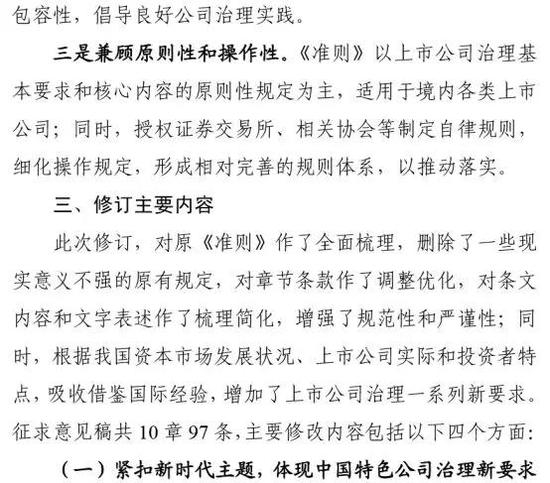 编者按:6月15日,证监会发布关于就修订《上市公司治理准则》公开征求意见的通知,欢迎公众提出反馈意见,意见反馈截止时间为7月14日。证监会同时公布了《上市公司治理准则》(征求意见稿)、修订说明。此征求意见稿共10章97条,由证监会单独颁发。而此前实施的《上市公司治理准则》由证监会、国家经贸委联合于2002年1月发布,共8章95条。
