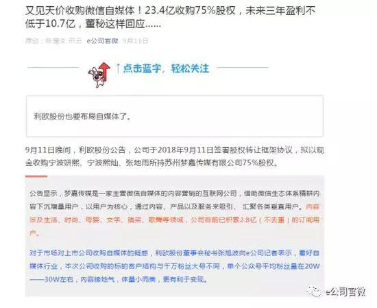 e公司曾报道过瀚叶股份收购自媒体量子云在线的案例,对于此次利欧股份又将出手高价收购自媒体公司,e公司也第一时间进行报道,引起了市场的高度关注。
