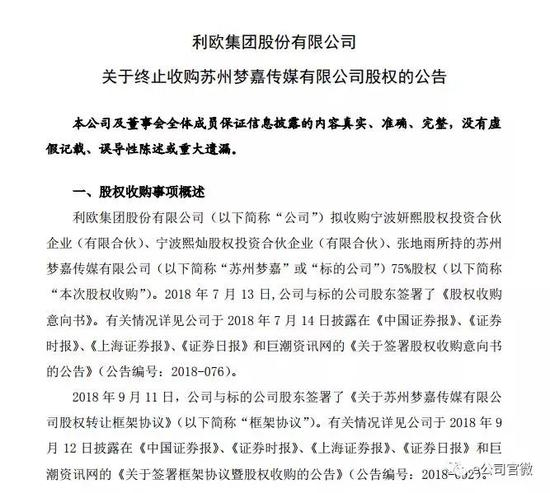 最终利欧股份选择了放弃。10月12日晚间,利欧股份宣布鉴于近期证券市场的巨大波动,协议各方对标的公司估值存在较大差异,经友好协商,协议各方决定终止该收购项目,并于2018年10月12日签署了《苏州梦嘉传媒有限公司股权转让框架协议之解除协议》。