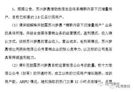 深交所要求公司说明苏州梦嘉目前运营微信公众号的数量,前十大微信公众号的运营情况以及内容生产方式,以及苏州梦嘉的编辑人数,并结合微信公众号数量及每日推送文章数量,说明标的资产编辑人员与业务规模的匹配性。