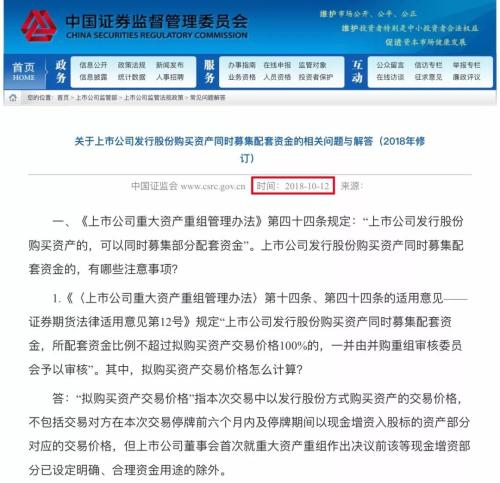 10月12日,证监会刊发《关于上市公司发行股份购买资产同时募集配套资金的相关问题与解答(2018年修订)》,对并购重组中的一些常见问题进行了细化。