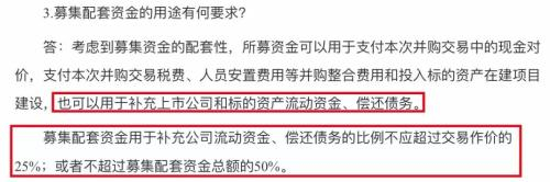 证监会依然对“补血”及偿债的比例进行了限制:募集配套资金用于补充公司流动资金、偿还债务的比例不应超过交易作价的25%,或者不超过募集配套资金总额的50%。