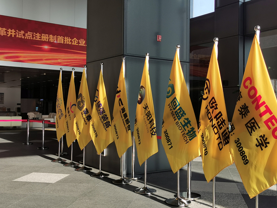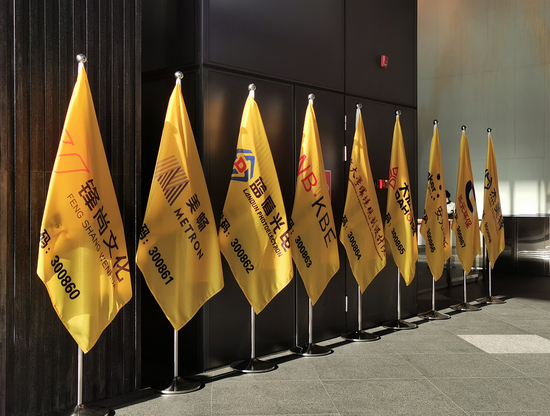 深交所大楼一楼大堂里,两侧立有代表着18家企业的旗帜。