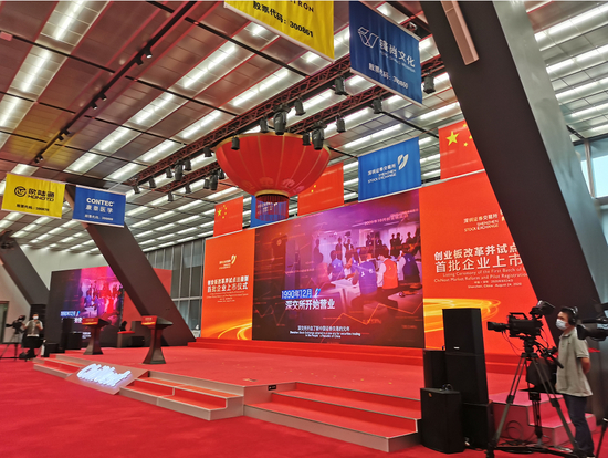 8:40上市仪式正式开始。深交所总经理沙雁以主持人身份亮相,宣布创业板注册制首批企业上市仪式开始。