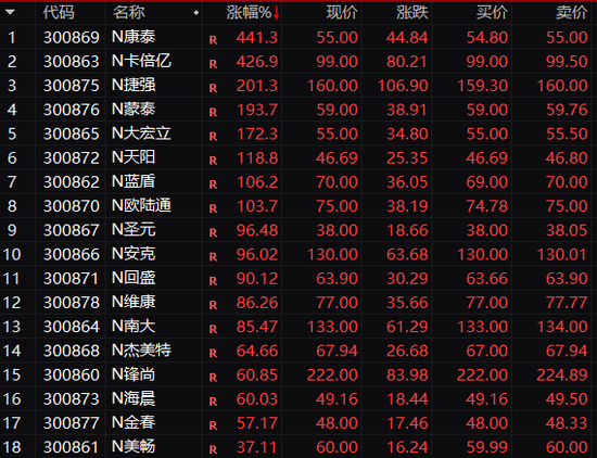 9:25,18只创业板注册制新股正式上市交易,18只股票全部飘红,其中,N康泰涨幅最大,达441%;其次是N卡倍亿,涨幅也超过400%;N捷强位居涨幅榜第三,涨幅为201%。
