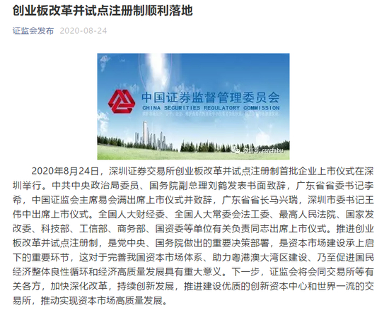 创业板注册制开启:刘鹤、易会满致辞 创业板进入20%涨跌幅时代