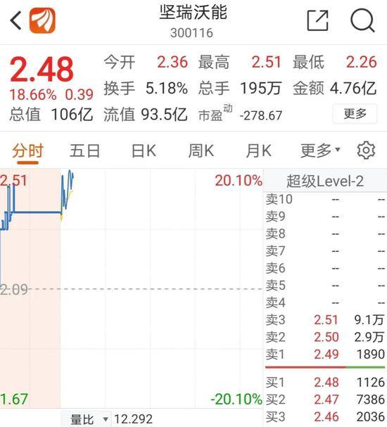 随着创业板注册制的正式开始,创业板也正式进入20%涨跌幅时代。坚瑞沃能盘中触及20%涨停,成创业板注册制首只触及涨停的个股。