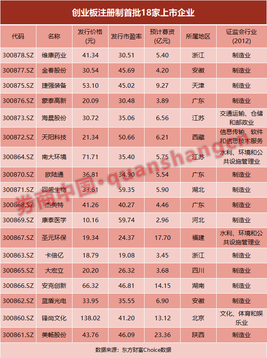 首批上市的18家公司分别是维康药业、金春股份、捷强装备、蒙泰高新、海晨股份、天阳科技、南大环境、欧陆通、回盛生物、杰美特、康泰医学、圣元环保、卡倍亿、大宏立、安克创新、蓝盾光电、锋尚文化、美畅股份。
