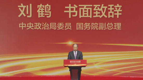 ▲易会满代中央政治局委员、国务院副总理刘鹤进行书面致辞