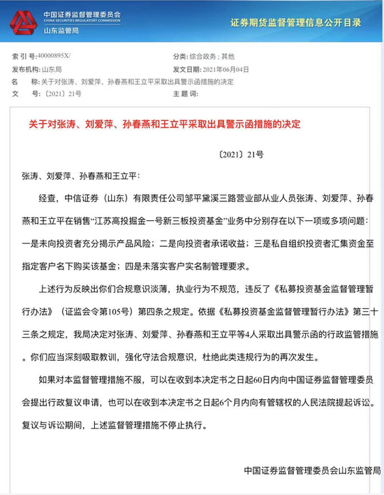 6月4日,山东证监局对中信证券山东营业部4名证券从业人员开出了行政监管罚单。