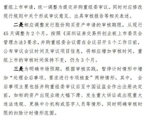 二是相应调整发行股份购买资产申请的审核期限,从现行45天调整为2个月。按照《深圳证券交易所创业板上市委员会管理办法》要求,并购重组委会议需在会议召开5个工作日前,公布审议会议时间及审议项目信息,将相应增加审核时间。
