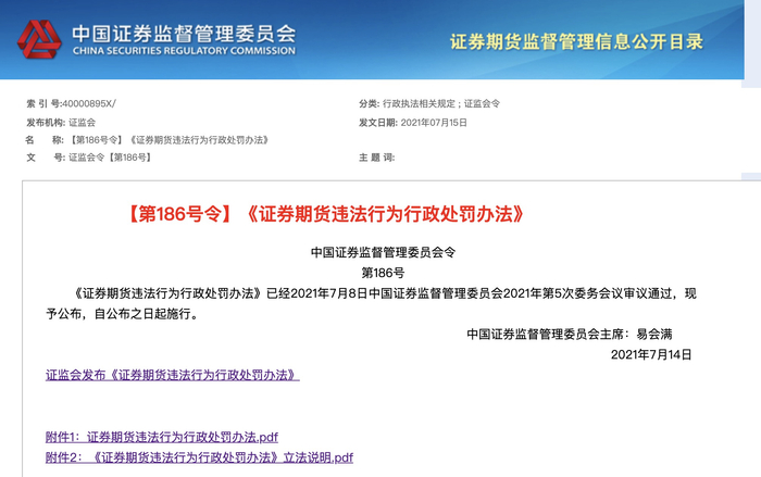 财联社(上海,记者 刘超凤)讯,2021年7月15日,证监会发布了《证券期货违法行为行政处罚办法》(以下简称《处罚办法》),自公布之日起施行。