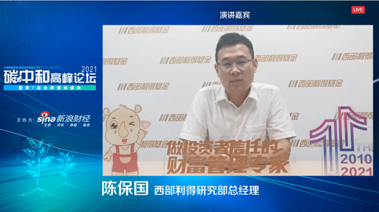 西部利得基金研究部总经理陈保国出席会议并做主题发言,他针对碳中和大势下的投资机遇,以及如何获取绝对收益的话题发表观点。他表示碳中和是个持续40年、拥有数百万亿空间的投资机会,涉及新能源、碳减排和碳交易三大方面。
